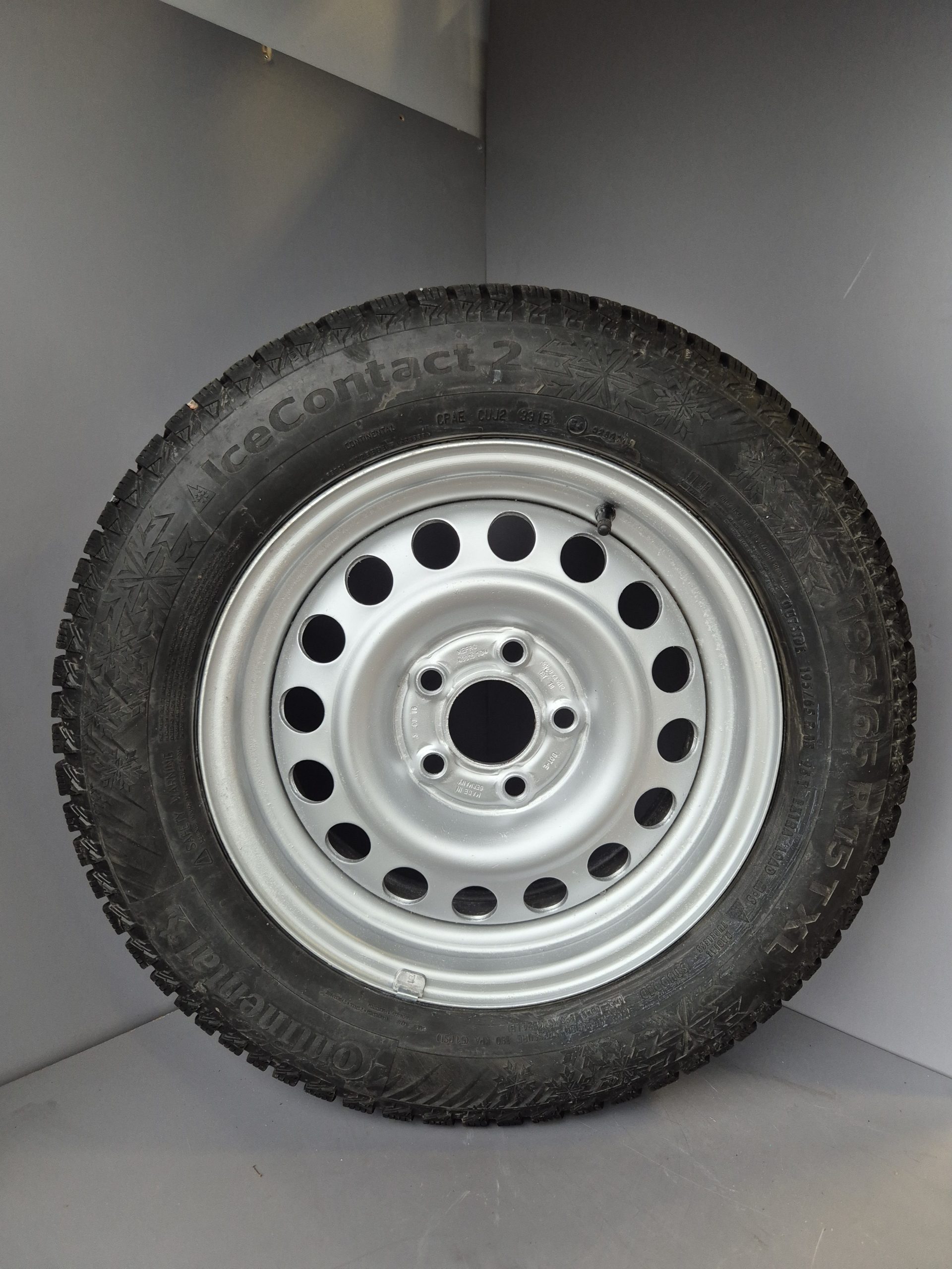 Peräkärryn peltivanteet 5,5×15″ 5×112 jaolla, ET 30. Continental IceContact 2 nastarenkailla 195/65-15, DOT 3315.